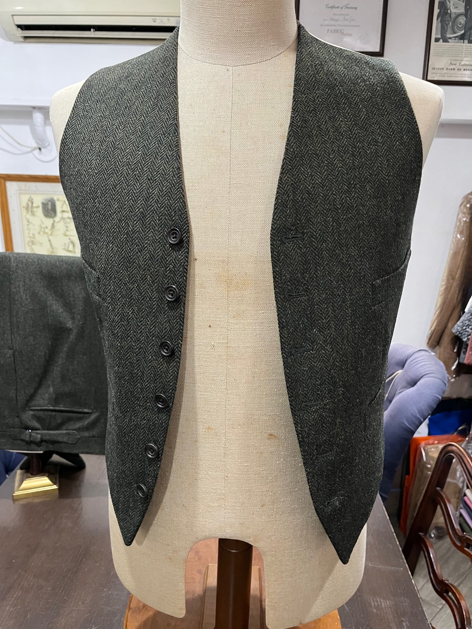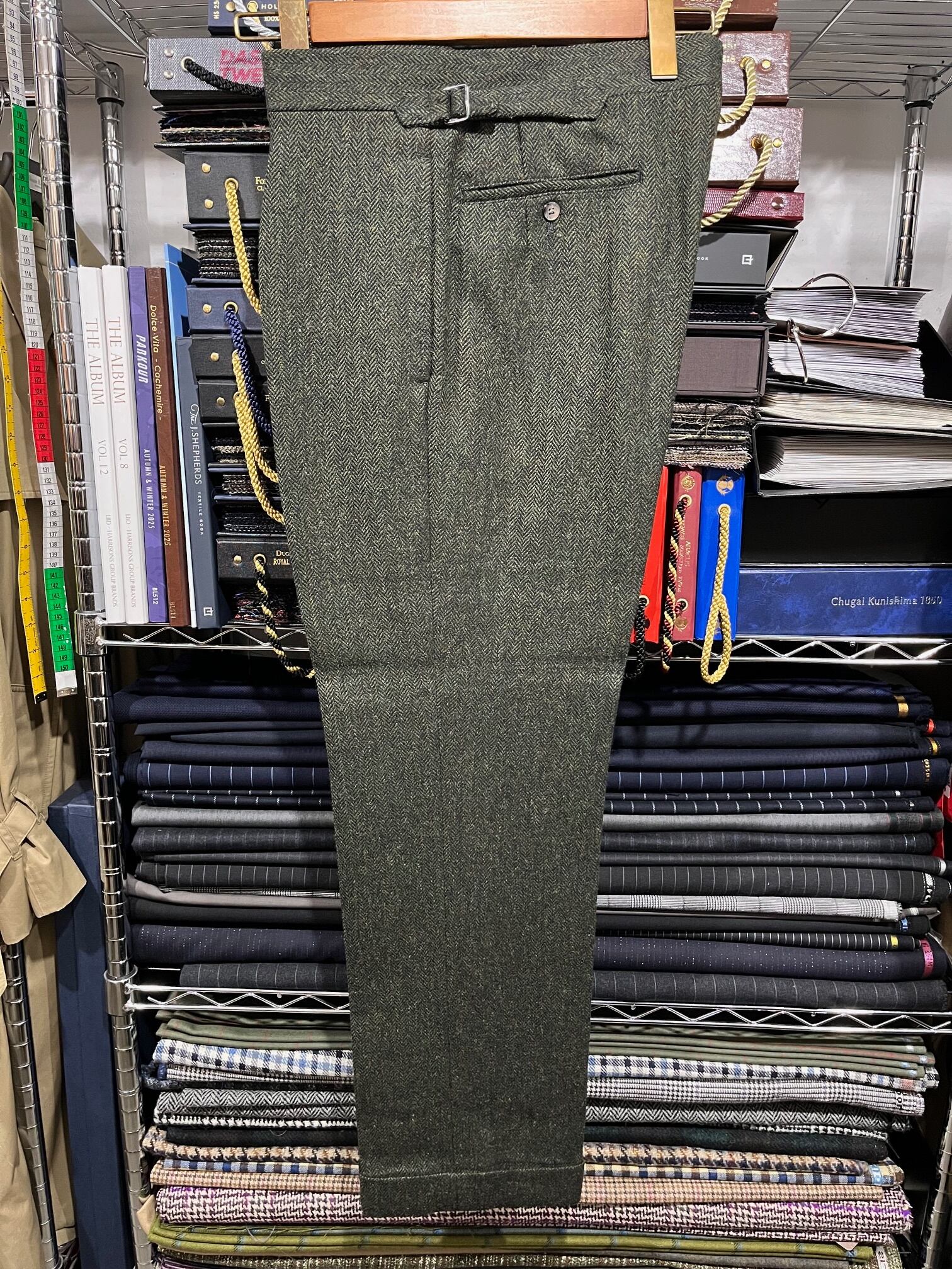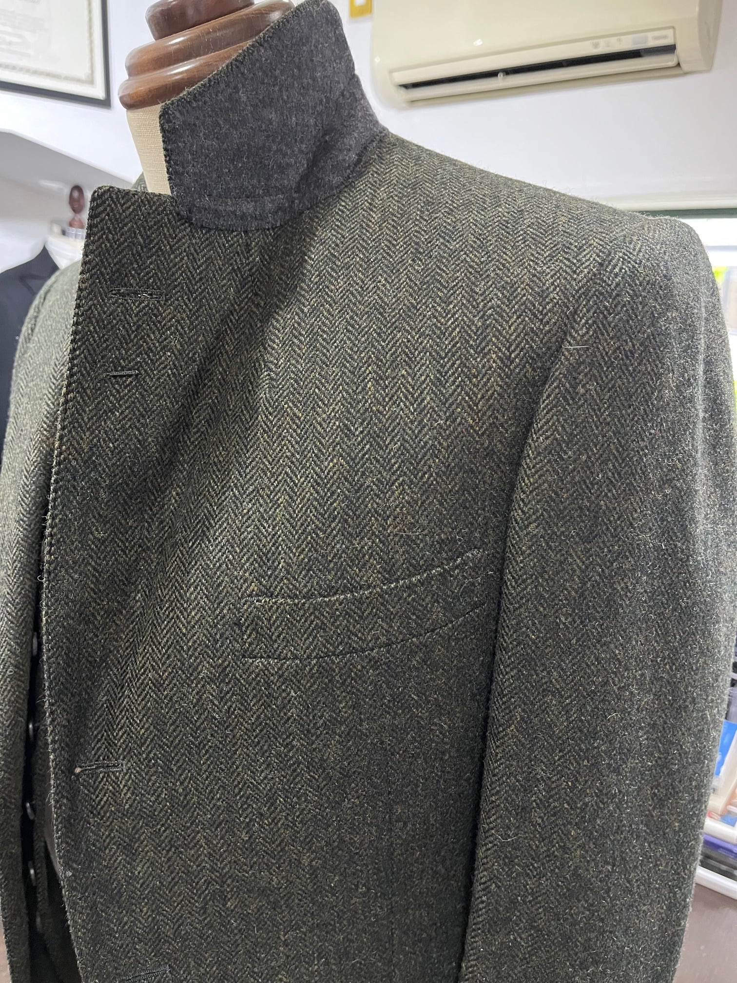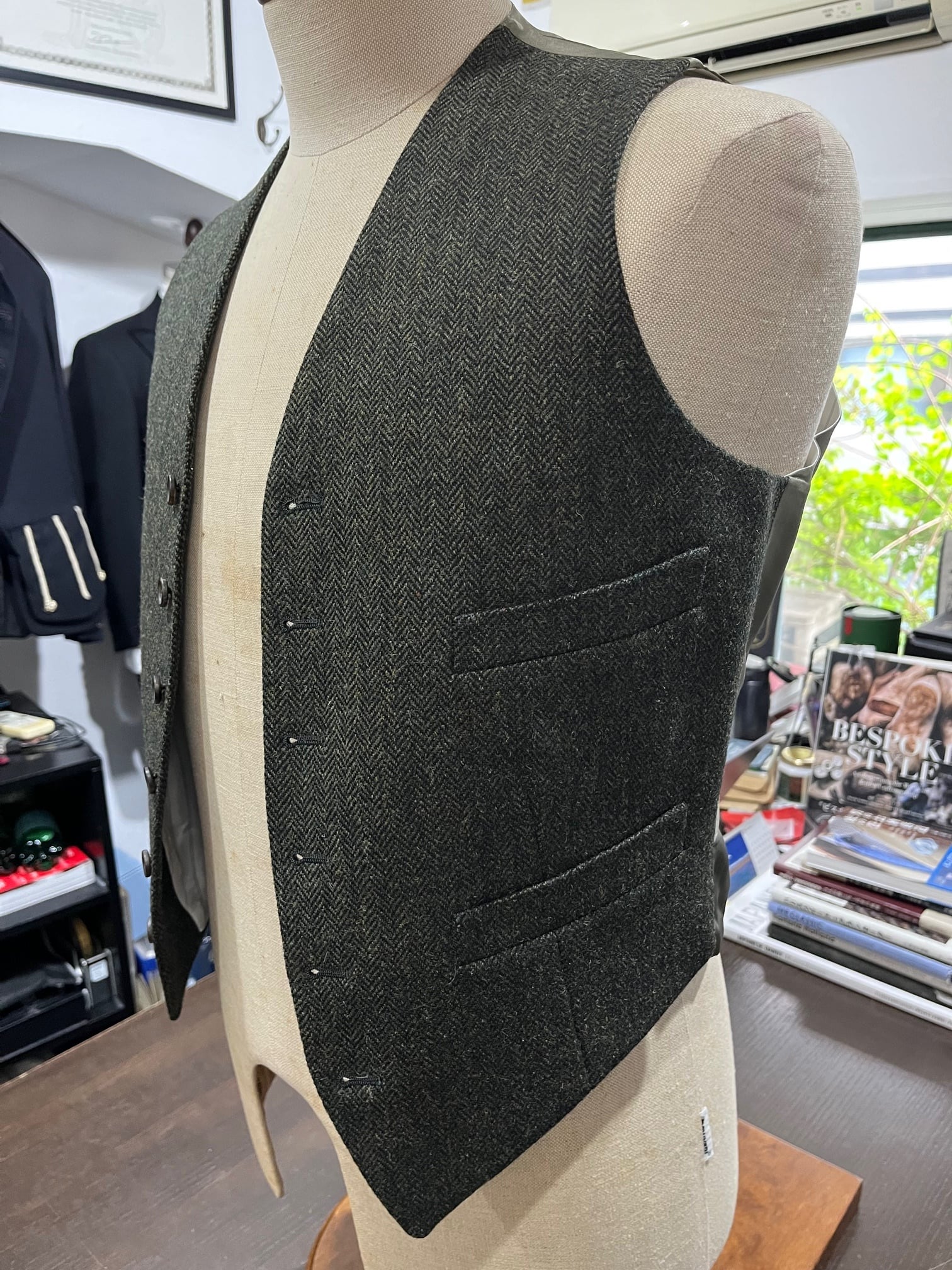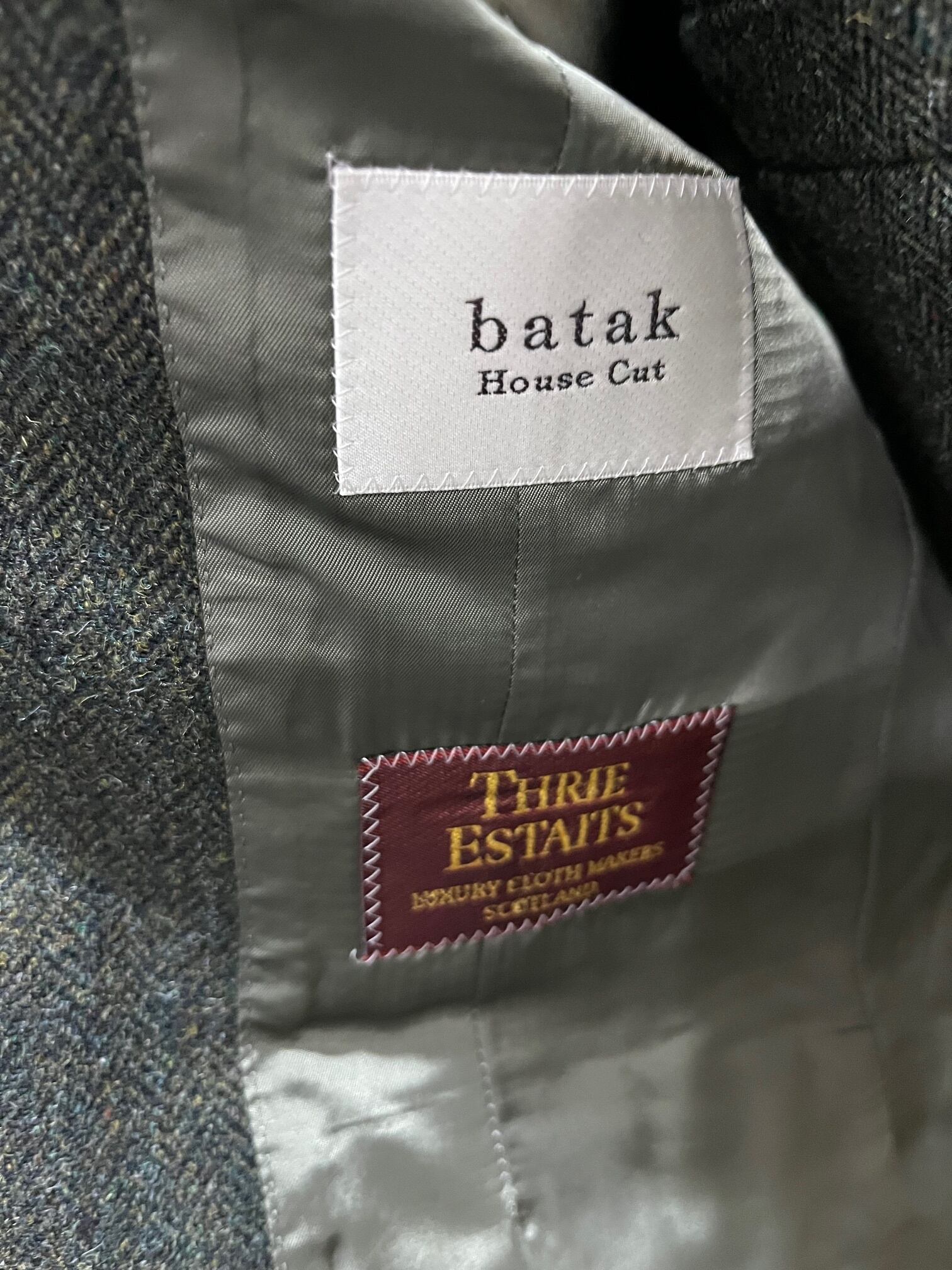 日本が誇るテーラーbatak House Cut(バタク)のTHRIE ESTAITS Tweedのグリーン 3ピーススーツです。