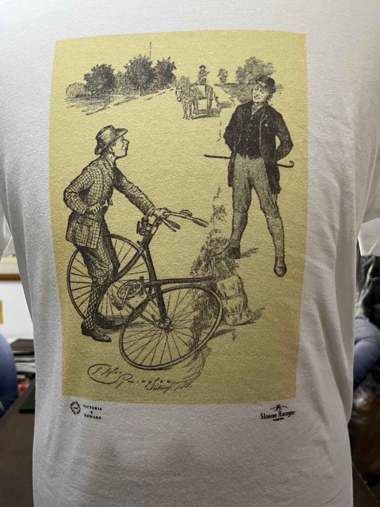 英国ヴィクトリア時代のイラストで、自転車のNorfolk JacketにPlus foursの男性とFrock coatの男性が丁寧な構図で描かれており、物語を連想させるレトロなイラストをプリントしました。