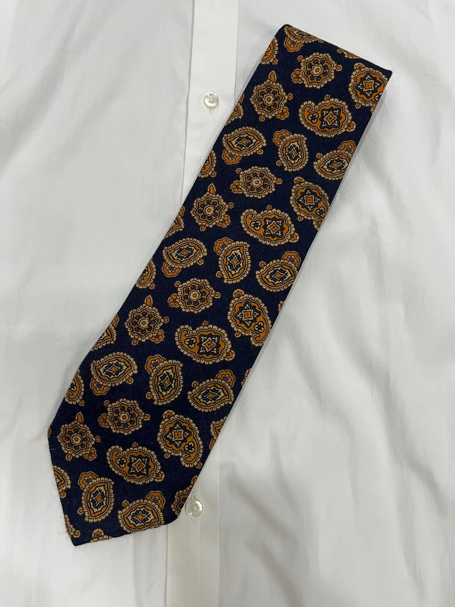 こちらはネイビーペイズリー柄ウールで結んだ時に優雅なドレープが出ます。