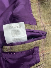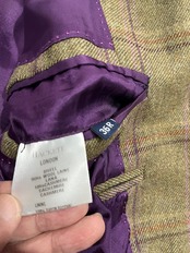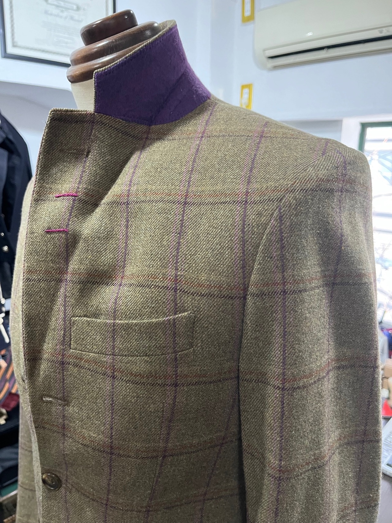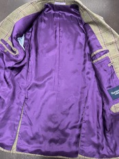 カシミア10%混のグリーン地にパープルのチェックでチェックに合わせたパープルの裏地が粋です。