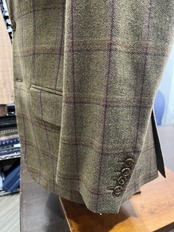 3釦シングルノッチドラペル。袖4個釦(本切羽)。サイドベンツ。総裏。